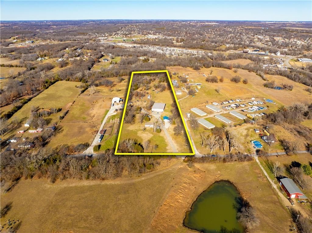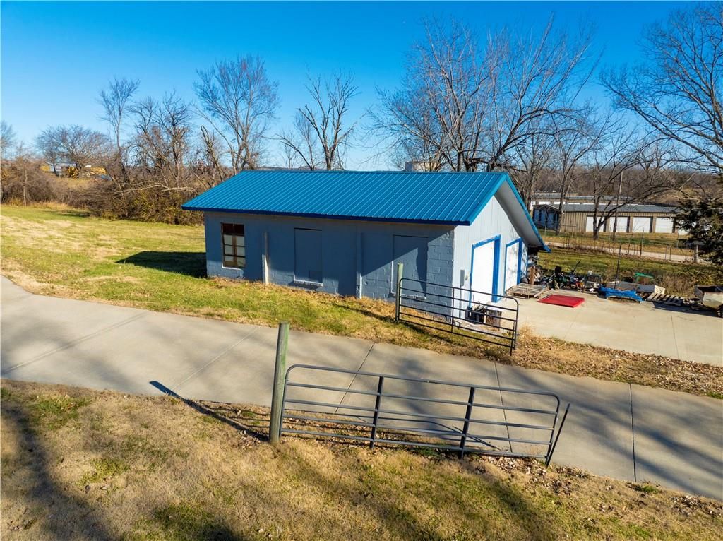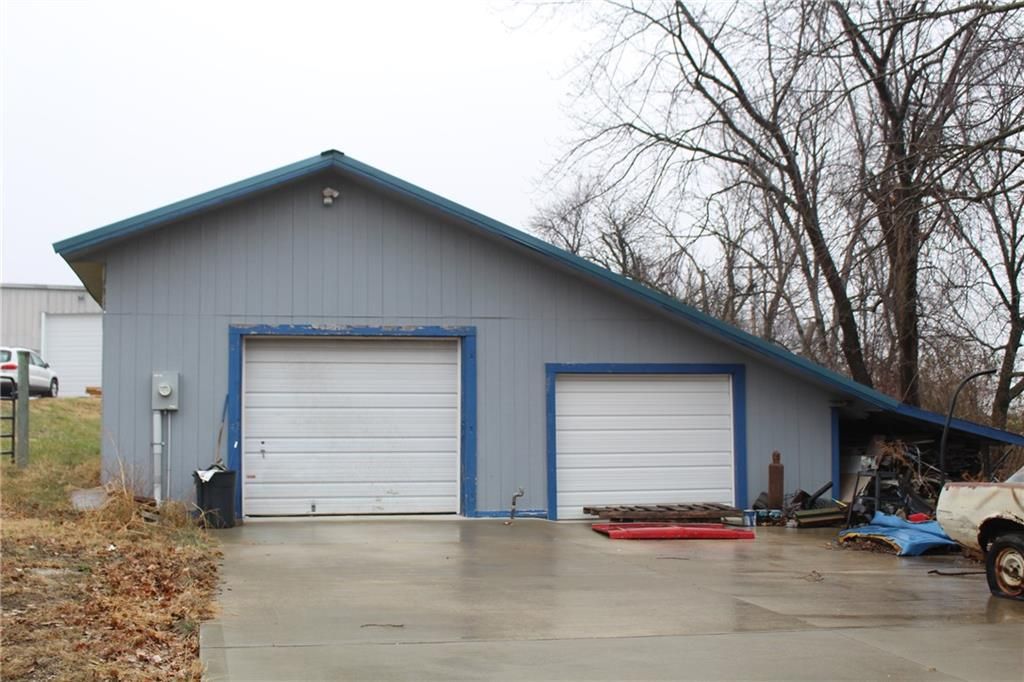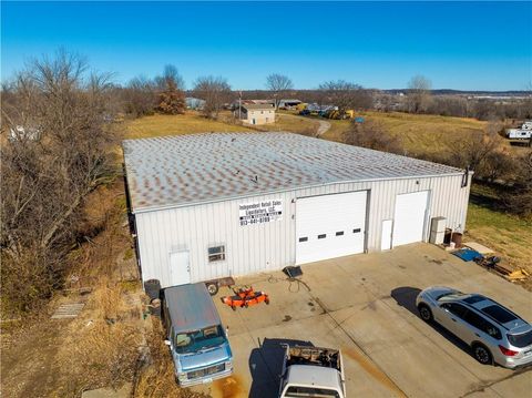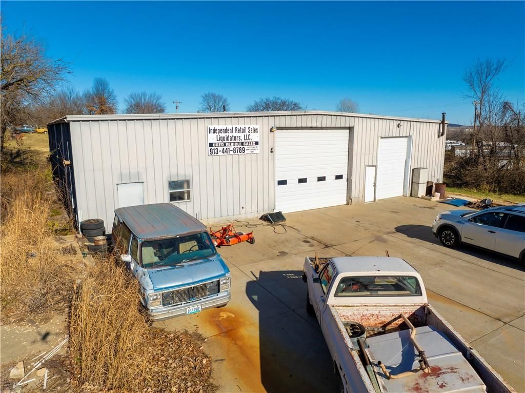CURRENTLY: COMPLETE PAINT & RESTORATION for Cars and Trucks! Salvage/Storage License pass with property! Auto salvage in past. Seller recently leveled rear 5 acres w/ concrete, asphalt, & dirt from road construction! CURRENTLY STARTING a Month to Month STORAGE RENTAL for cars, RV camper, trailers, motorhomes & equipment w/ plans for 100 rental spots at $100 per month! GREAT LOCATION JUST WEST OF BONNER SPRINGS W/ ACCESSIBILITY TO (7 Highway, I-70, and I-435) SETTING 10 ACRES M/L FOR BUSINESS! 72'x100'=7200' square foot Garage/Workshop w/single phase, 16'x14" and 12'x9' front doors, heavy duty steel construction frame work for building, metal siding & roof, sprayed on insulation on walls and ceiling, high efficiency lighting (2 years old) and some LED light in additional work room. Additional work room (24x25) and Office w/single unit heat/air. Office 21x22 with 9x12 bath with stool, sink, and shower. Main work area w/ overhead propane furnace (300000 BTU). All auto equipment, lifts, painting booth, cabinets, air compressor system, etc. do not stay! Add: 2 car garage workshop 34'x30' concrete block construction w/ separate electric service. Also has a small lean to, roof is 3 years old. Separate septic systems for the house & main garage/workshop. 6" poured concrete drive to home, second garage, & main shop! RAISED RANCH 1000+ sq. ft on main floor w/separate electric service has kit. (12x13). dn. rm (10x11), lv. rm (12x18), WBFP top and bottom floors, bdrm. (11x12), bdrm. (11x11), possible none conforming bdrm. (10x22) in bsmt. & fmly. rm (17x22) both not completed but need a little more sheet rock work. Home w/ separate electric service, septic system, and on natural gas (Atmos Gas KCK), front deck is 6 years old. Ceramic tile kitchen floor & hardwood in remaining first floor. House was rented in past for $1550 and 2 car garage for $600 which could pay the taxes. Owner needs 30 days to vacate after close of sale! Selling in its present as-is condition.