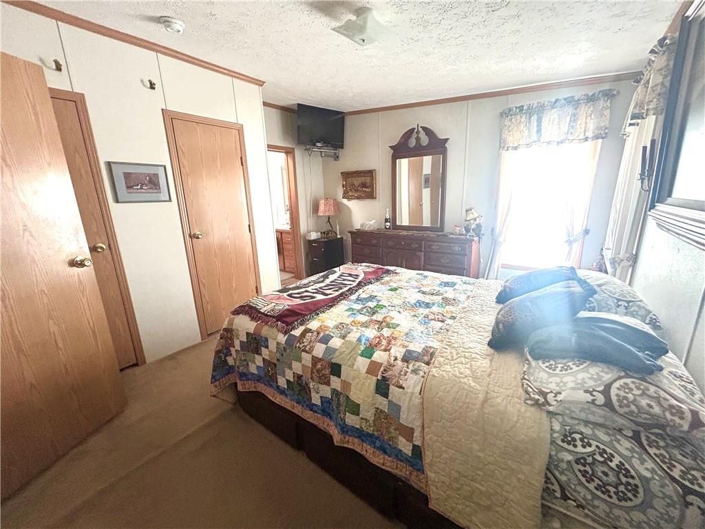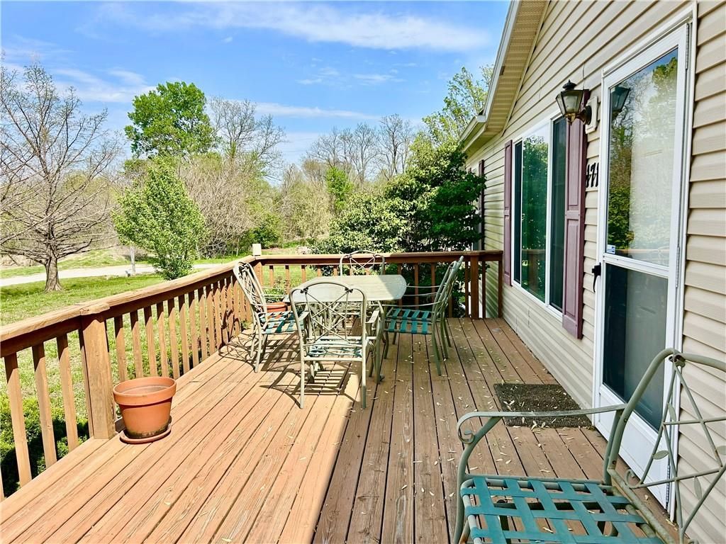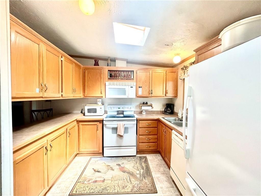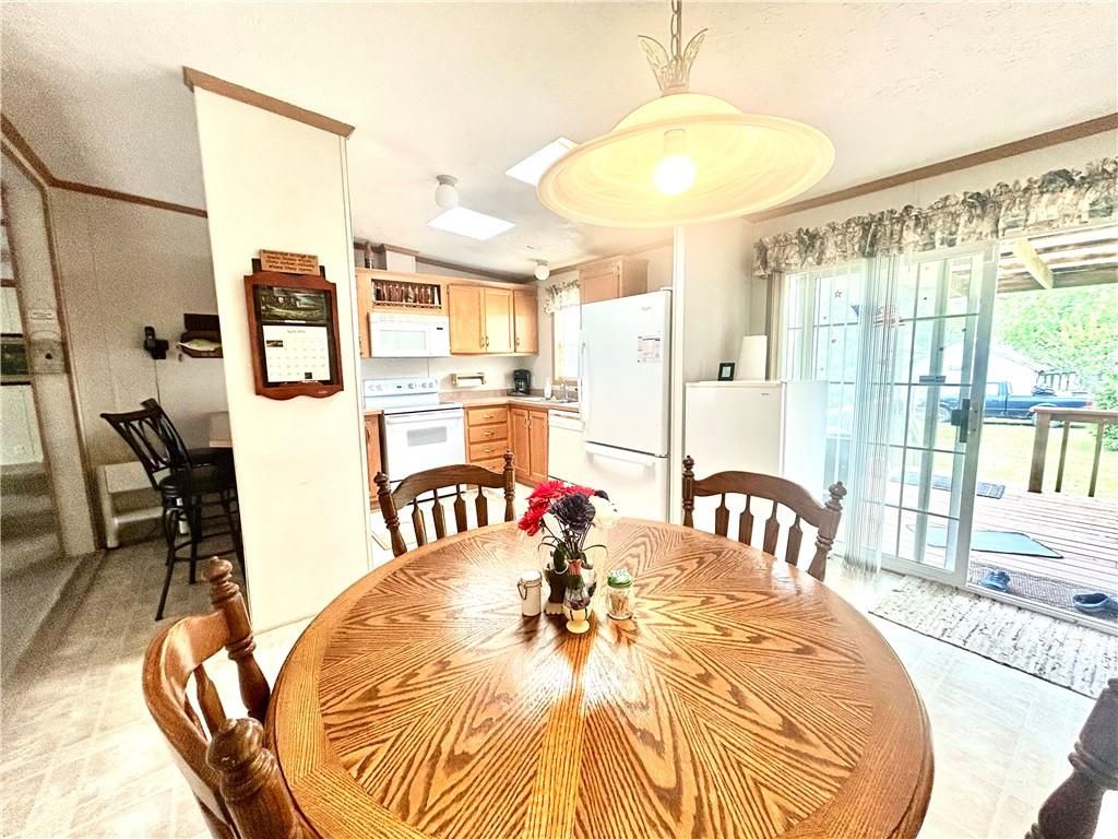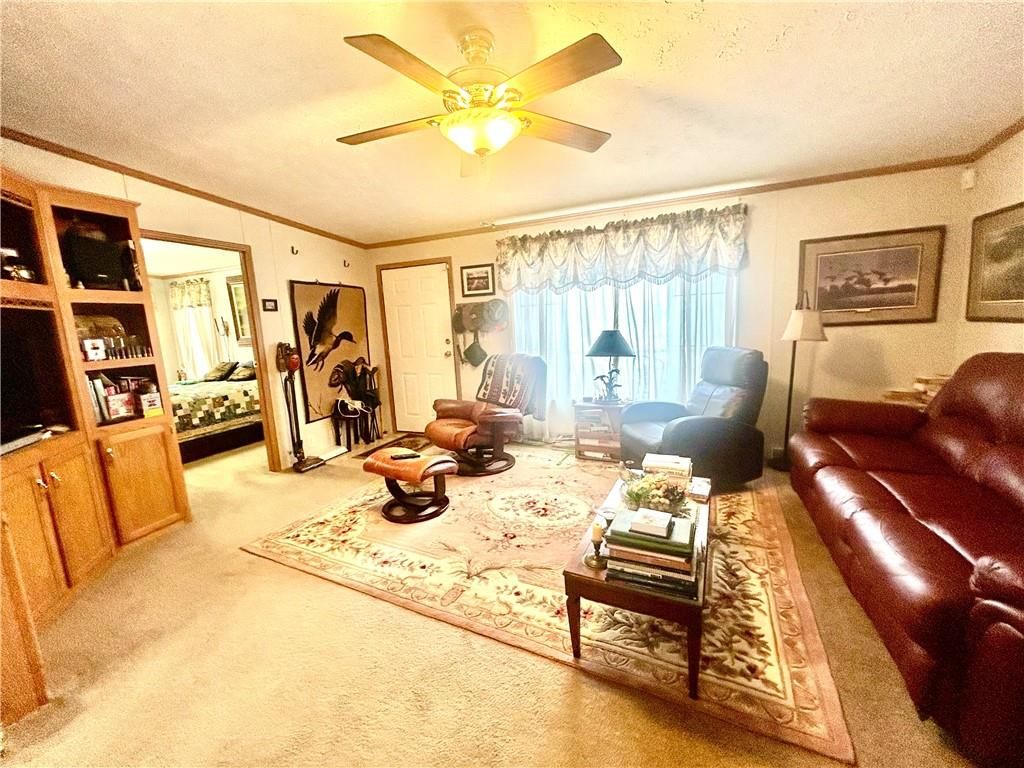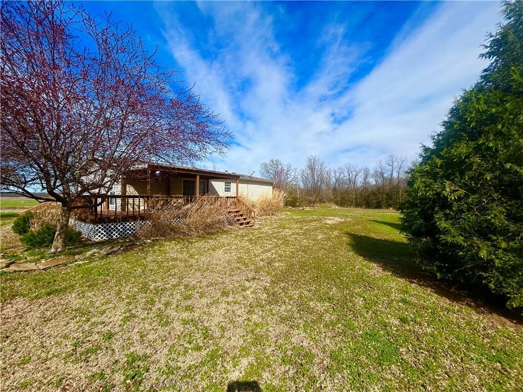 A Green Oasis corner lot and water front view with a comfortable Well maintained manufactured home and massive shop awaits; Newer roof, HVAC and water heater. Wonderful mature trees and landscaping already done. An expansive 3 bay shop has an additional locked hobby room for an office & projects. 3 bedrooms and 2 full baths allow for a comfortable place to spread out. The bedrooms are very nicely sized. Skylights in the kitchen keep the whole main area bright and sunny. Eat at the bar, or in the dining area and enjoy big living areas. Front and covered back decks will allow for wonderful views of the sunrise and sunset while you grill out or sip that morning coffee. Very private and quiet dead end gravel road. NE outer edge of small town. The fishing dock is a public fishing area; fish, or relax and watch.