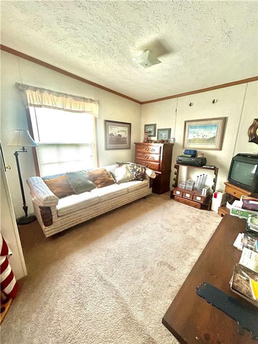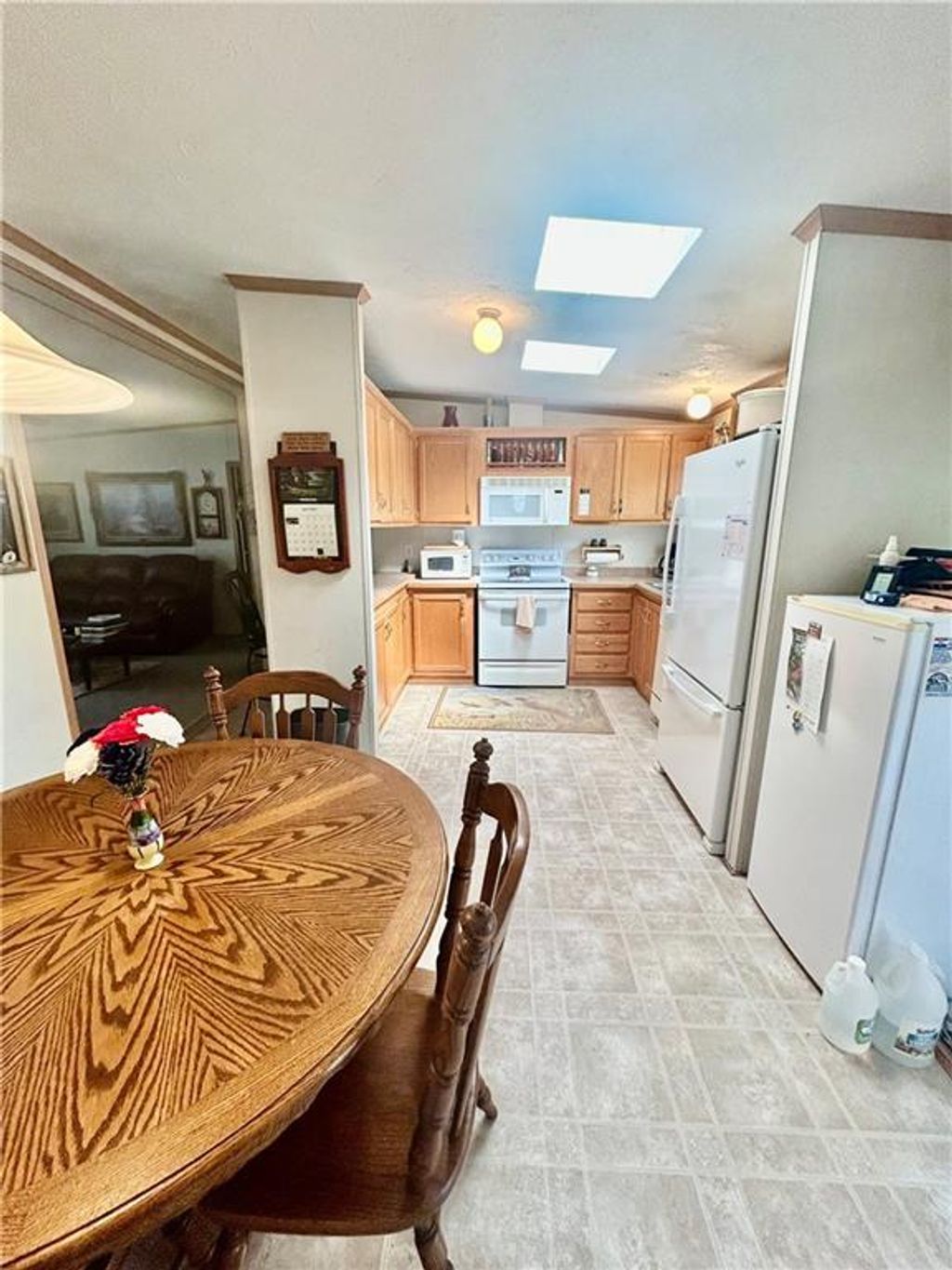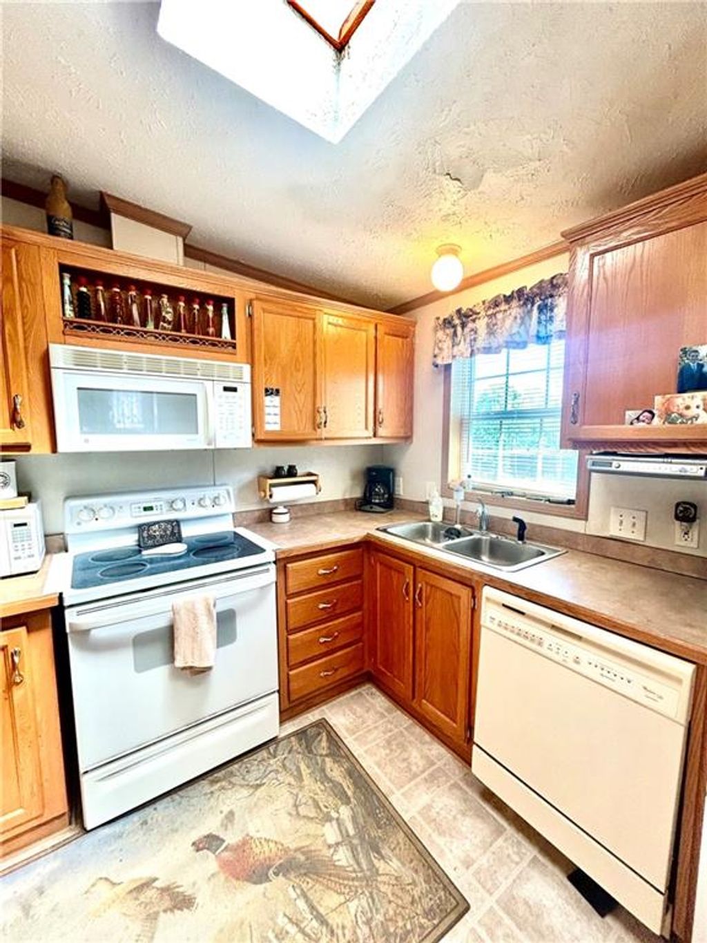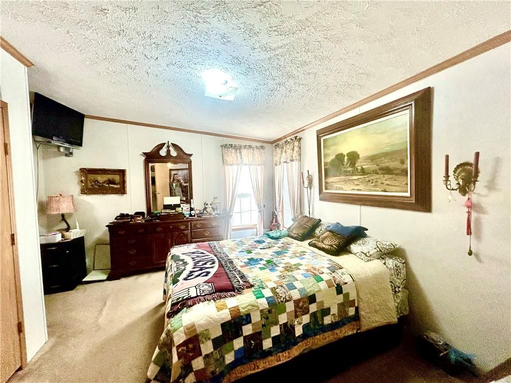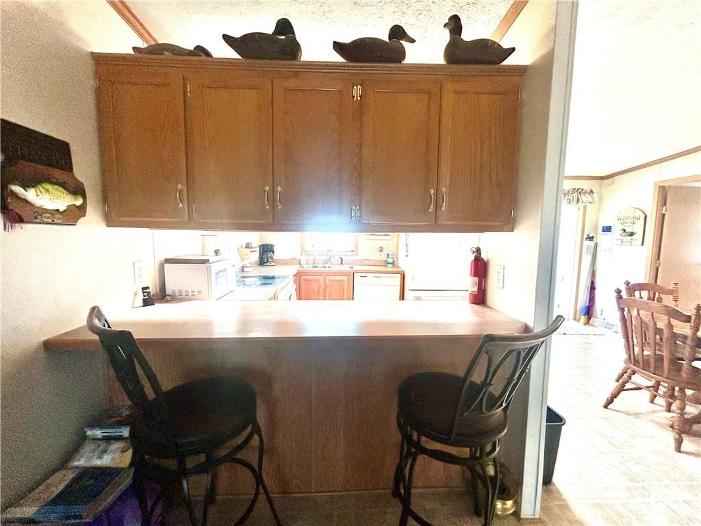 A Green Oasis corner lot and water front view with a comfortable Well maintained manufactured home and massive shop awaits; Newer roof, HVAC and water heater. Wonderful mature trees and landscaping already done. An expansive 3 bay shop has an additional locked hobby room for an office & projects. 3 bedrooms and 2 full baths allow for a comfortable place to spread out. The bedrooms are very nicely sized. Skylights in the kitchen keep the whole main area bright and sunny. Eat at the bar, or in the dining area and enjoy big living areas. Front and covered back decks will allow for wonderful views of the sunrise and sunset while you grill out or sip that morning coffee. Very private and quiet dead end gravel road. NE outer edge of small town. The fishing dock is a public fishing area; fish, or relax and watch.