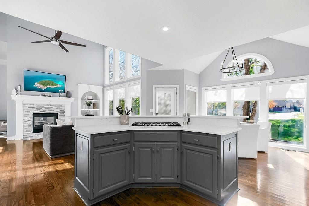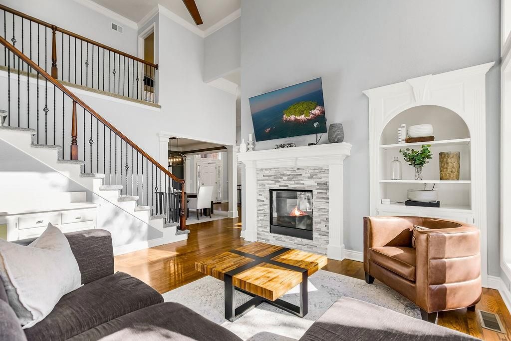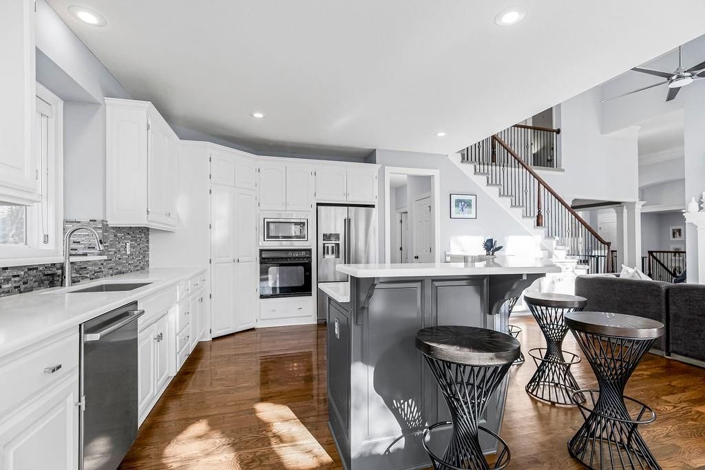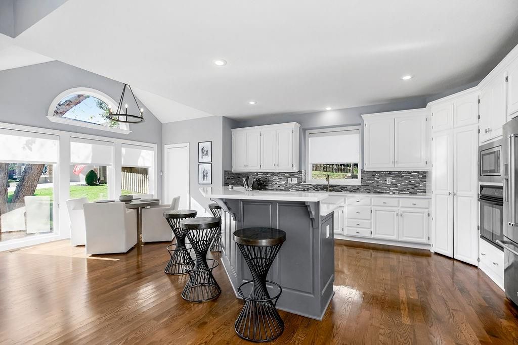 Discover the perfect home located in the Estates of Parkhurst in Lenexa. This 1.5 story has it all. The kitchen boasts a large walk-in pantry, quartz counters, gas range, & updated finishes. The home has 4 bedrooms, 3 full baths, and 2 half baths. Other upgrades in this charmer, include the newly renovated primary bath, huge walk in closet in the first floor bedroom, and stack stone fireplaces. The spacious basement is great for entertaining as you can visit the bar in the kitchen area, relax and watch your favorite movies, or exercise in the work out room. This is your home with everything you will want. YOU NEED TO SEE THIS ONE IN PERSON.