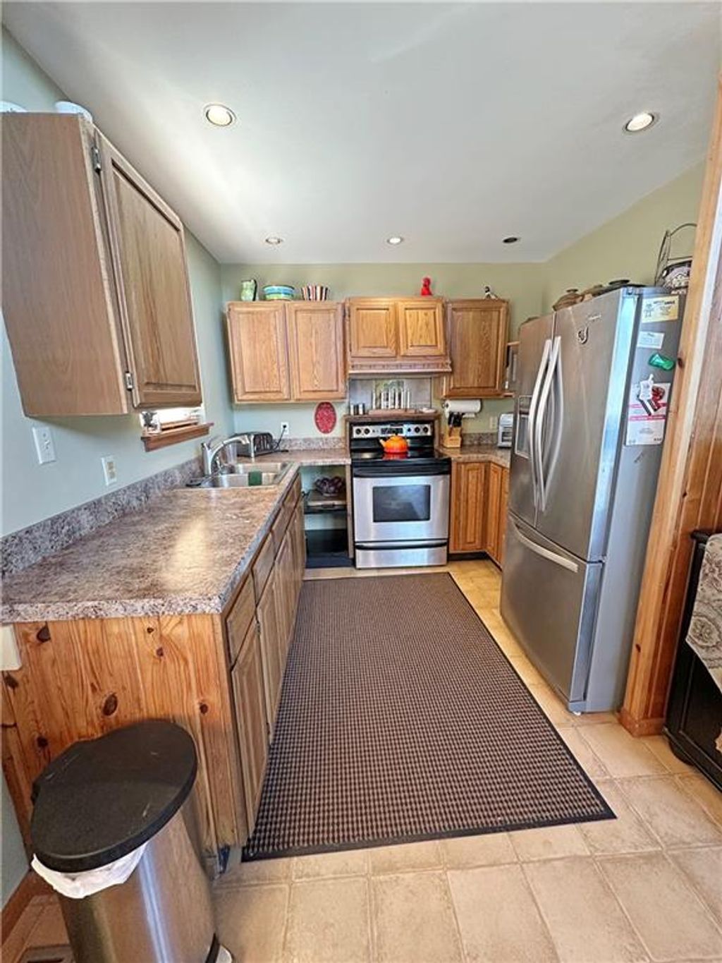 Waterfront Lake Home - Fully Furnished with Garage and Extra Lot with Storage Shed. This beautifully maintained, move-in ready, waterfront home on Lake of the Ozarks is fully furnished and includes an attached one-car garage. Offering over 1,500 square feet of total space, the 2-bedroom, 1-bath layout provides both comfort and functionality in a peaceful lakefront setting. Additional sleeping accommodations include two sofa sleepers. Relax on the covered front porch or enjoy the expansive, full-length covered deck with lakeviews - accessible from the living rm. area, which features vaulted wood ceilings and sliding glass doors. The open-concept design seamlessly connects the living, dining, and kitchen areas, making it ideal for everyday living or entertaining. The kitchen includes stainless steel appliances and a custom coffee bar adjacent to the dining area. The bathroom features a walk-in shower, and the laundryroom, located across the hall, includes built-in shelving and cabinets for added storage. Both bedrooms are carpeted and feature ceiling fans. This property comes with kayaks, a paddle boat, a Yamaha golf cart (stored in the garage), and an additional lot across the street that includes a storage shed - perfect for storing outdoor or recreational equipment. The shoreline offers over 90 feet of seawall, a private swim platform with benches (permitted through Ameren), and approximately 4-5 feet of water depth at full pool - suitable for flat-bottom or pontoon boats. Conveniently located near waterfront dining, marinas, and a variety of outdoor recreational activities such as boating, fishing, and exploring nature. This could be your new lake home!