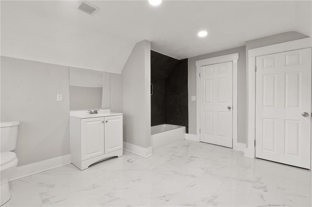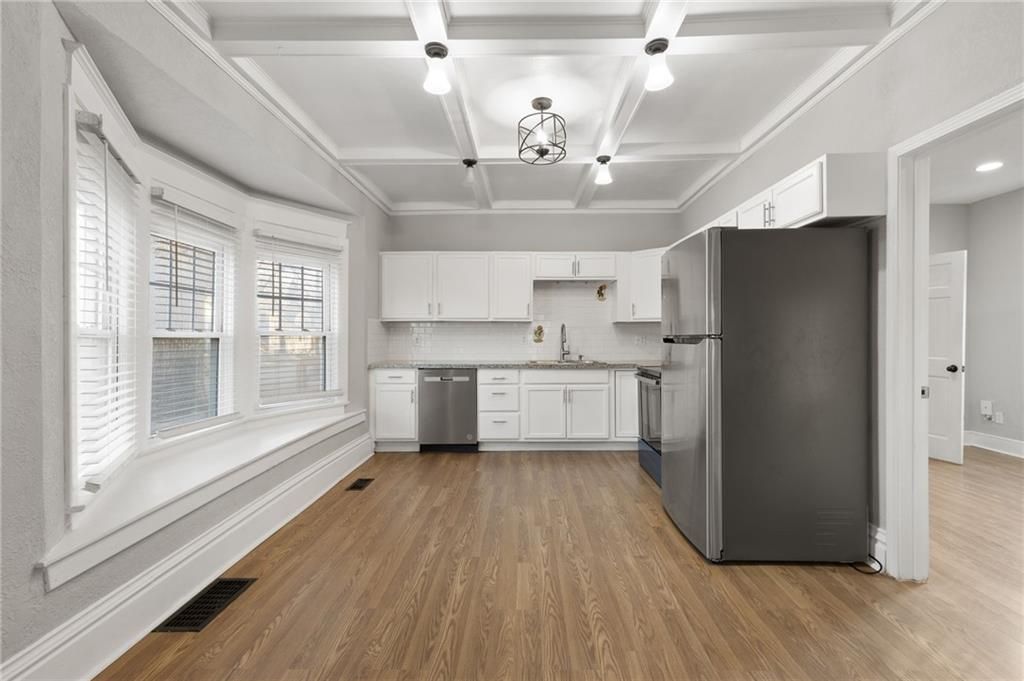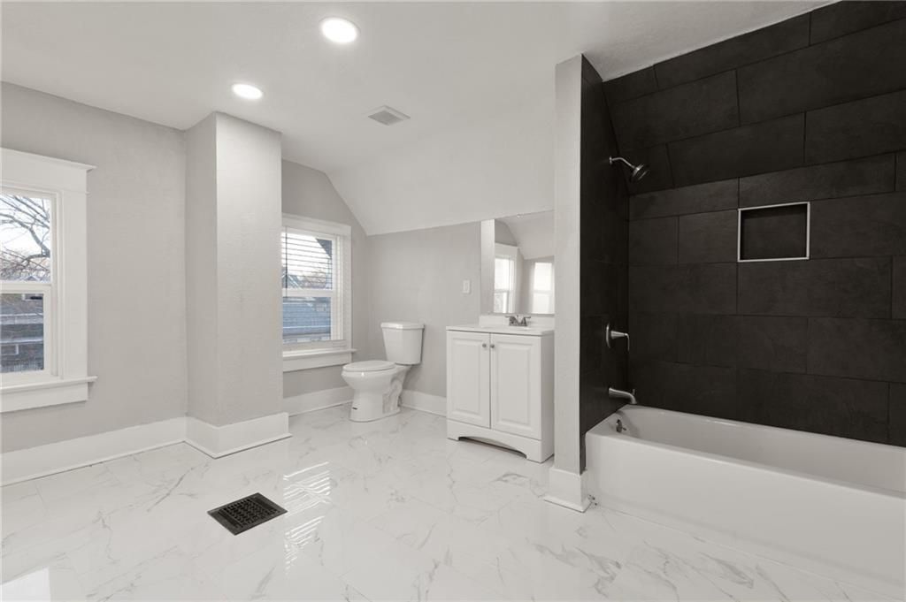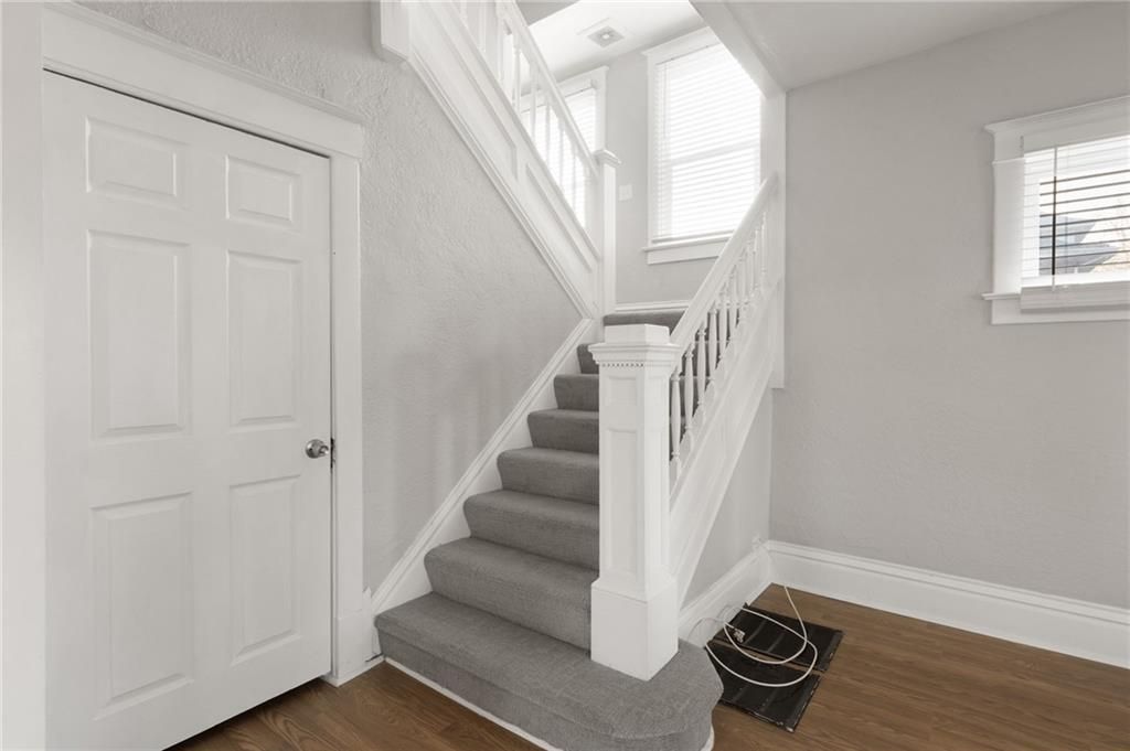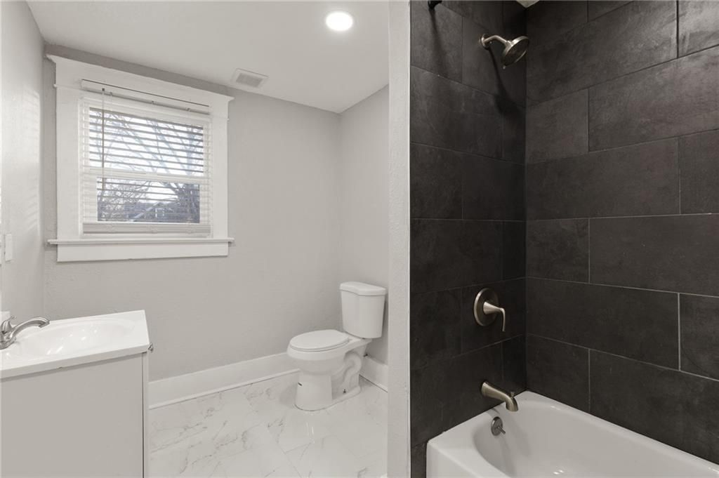 Step into this beautifully updated home where every detail has been thoughtfully refreshed. The bright, open foyer welcomes you with gleaming hardwood floors, soaring ceilings, and an elegant staircase that sets the tone for this stunning property. Natural light pours through oversized windows, highlighting the fresh neutral paint and crisp white trim throughout. The heart of the home features a completely renovated kitchen with white shaker cabinetry, sleek granite countertops, modern subway tile backsplash, and stainless steel appliances - perfect for both everyday living and entertaining. Retreat to the spa-like bathroom showcasing designer marble-look tile flooring, modern fixtures, and a dramatic black accent wall in the shower/tub area that creates a striking contemporary feel. The spacious backyard offers mature trees and endless potential for outdoor enjoyment. This home combines classic architectural charm with modern updates - truly a rare find that's move-in ready and waiting for you!