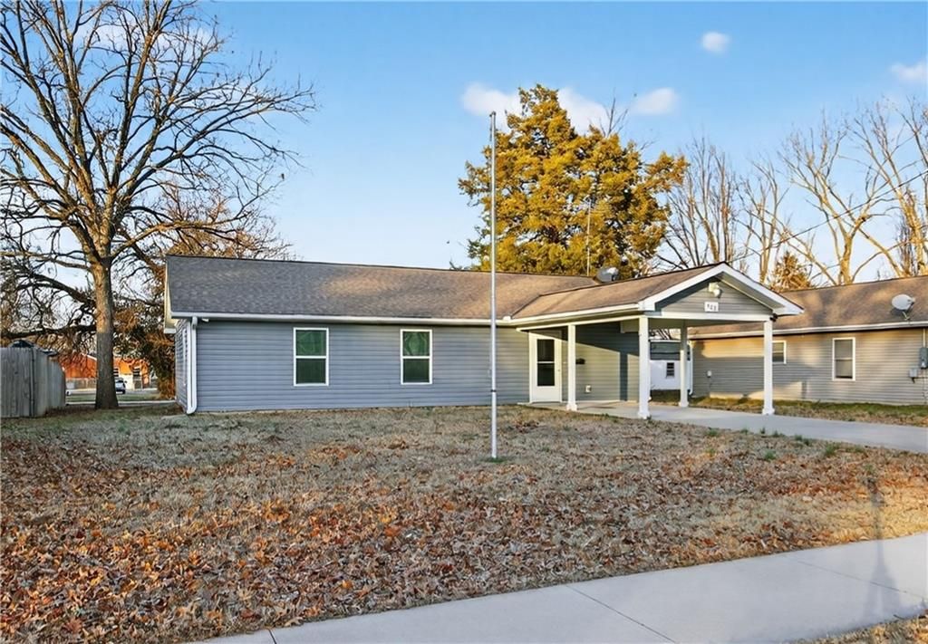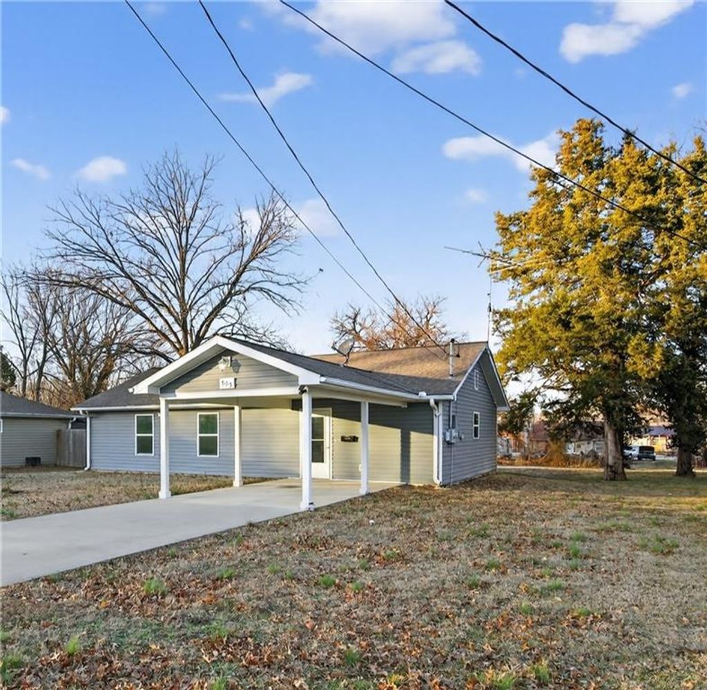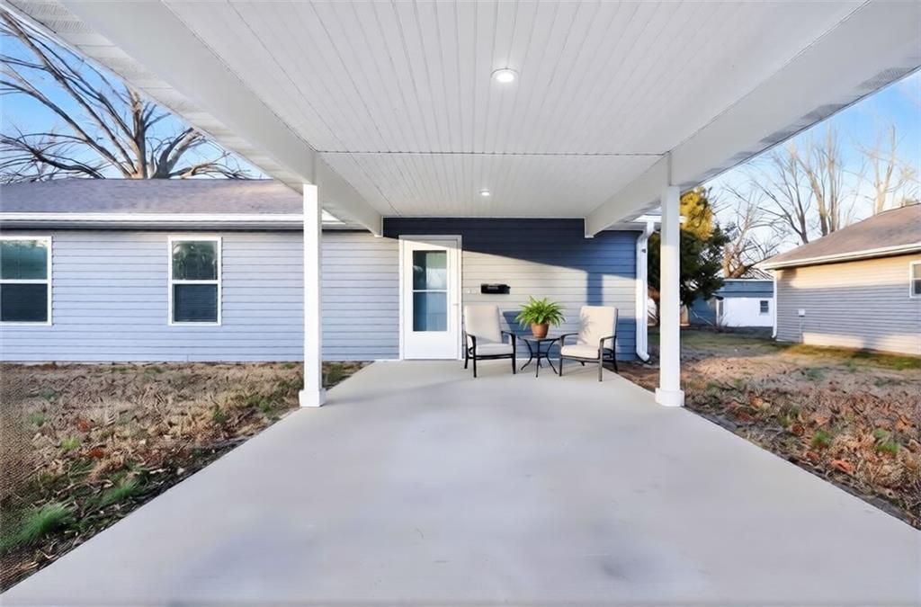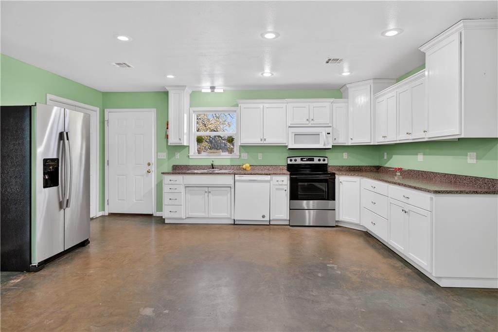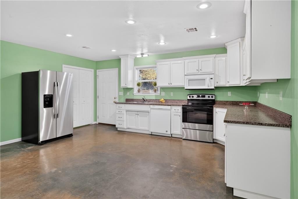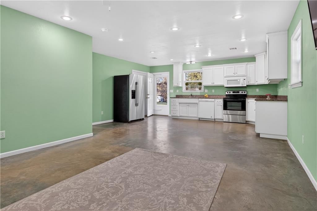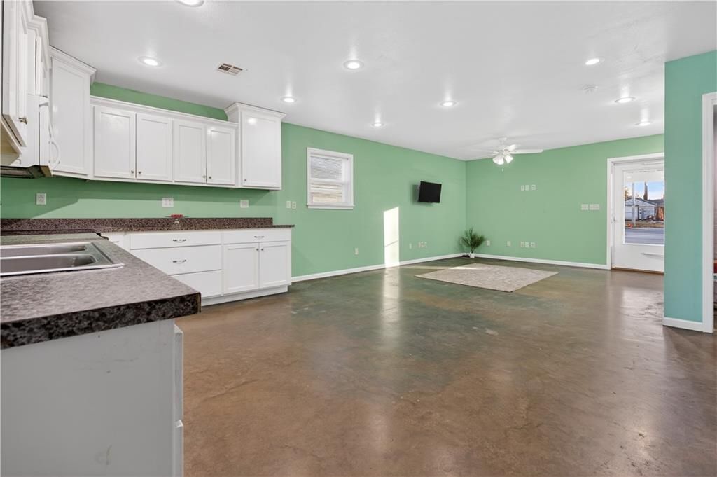 Only 10 years old, this cozy 3 Bedroom, 2 Bath is an exceptional offering! Approaching the home you'll find a beautiful 19x11 covered front porch with decorative white pillars, recessed lighting & additional parking pad space, large enough for patio furniture & relaxation. No need to struggle as you carry in groceries, this home is one level with no steps to contend with. The freshly painted, open design, of the living room, dining & kitchen space creates a feeling of happiness with great natural light that flows throughout the home. You'll love cooking in the kitchen with new stainless appliances, white cabinetry & granite style laminate countertops with abundant storage & space to be creative during meal preparation. The kitchen/dining area offers opportunity to add your own kitchen island with bar seating, or a more traditional table, depending on your personal taste. Throughout the home you'll find stained concrete flooring designed for a modern, sleek, appeal along with lasting durability. In the primary bedroom, retreat to the ensuite full bath to soak away the stress after a long day. The 2nd full bath, found near the 2nd & 3rd bedrooms, offers a wall separation between the sink & toilet, to allow for privacy while others can be present getting ready for their day. This home was built with energy efficiency & safety in mind with 19" of blown insulation, thermal windows, heat pump central electric heating system & much more! In the laundry you'll find a Green Tech system connected to the laundry lines which allows for less detergent use & a hot water free system. No need to worry during stormy weather, a concrete storm room/pantry is found off the kitchen providing peace of mind & functional versatility. If you love the outdoors, the large back yard is an open slate, waiting for your personal touch to be added. Close your eyes & just imagine: entertaining with friends, a pergola, firepit, and plenty of room for fido to play! The options are vast!