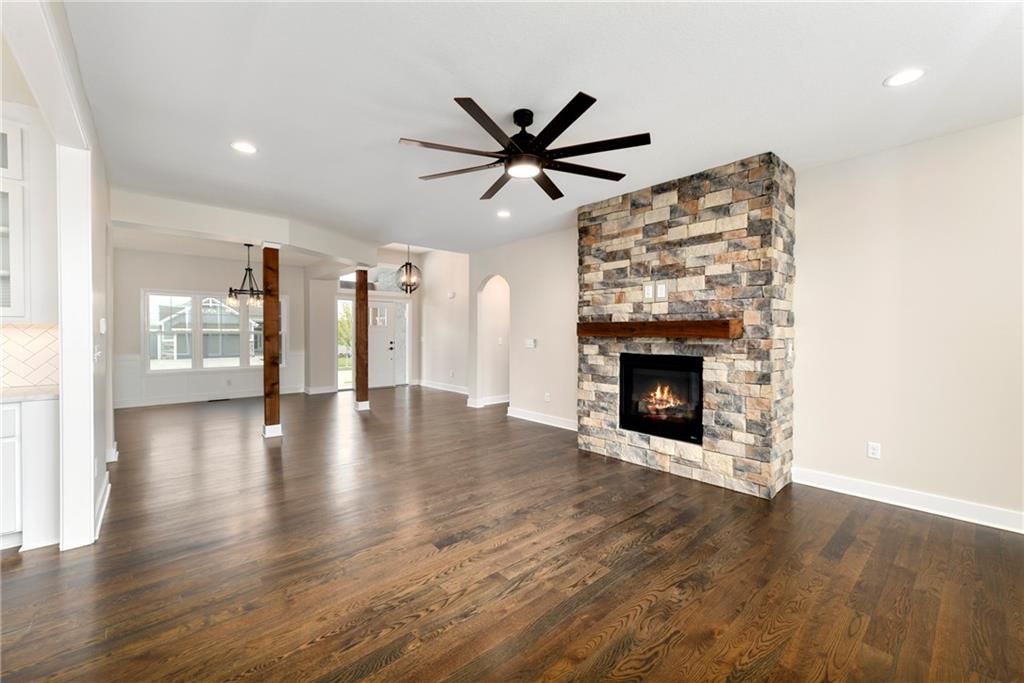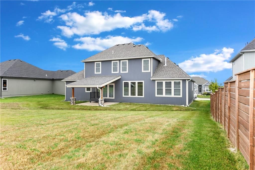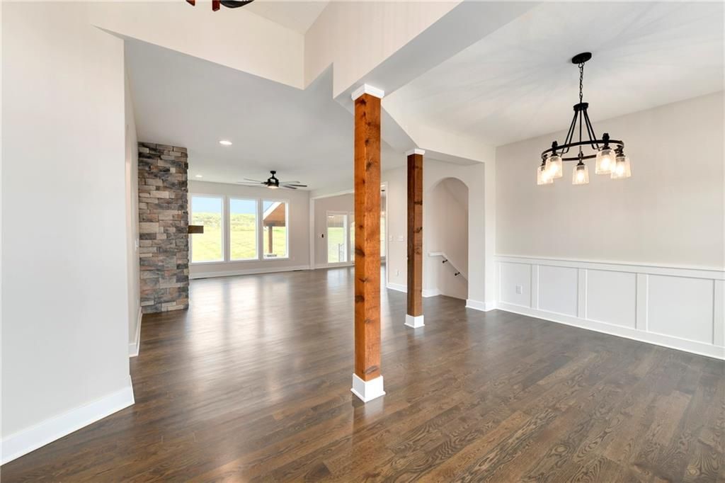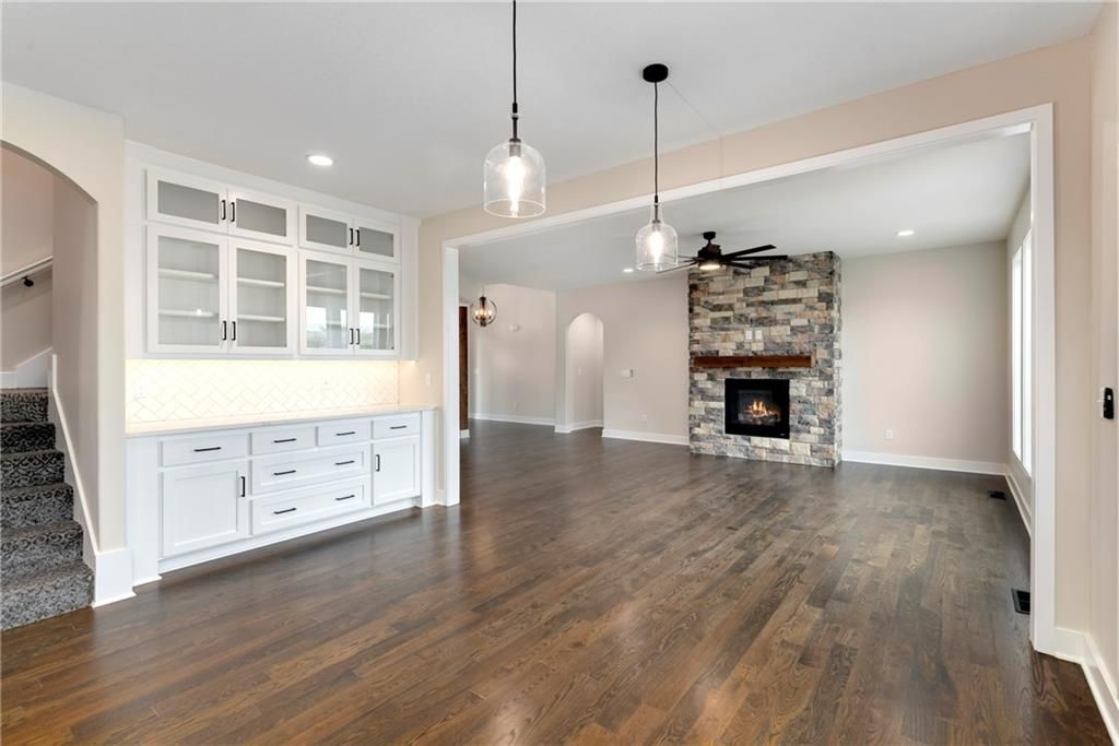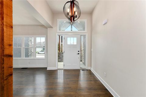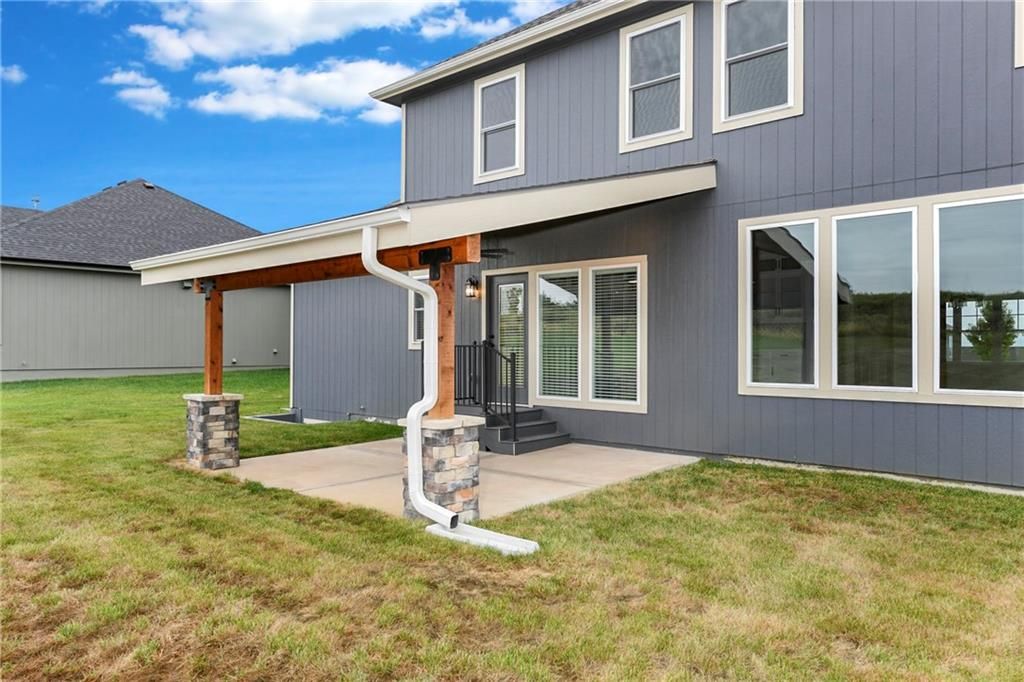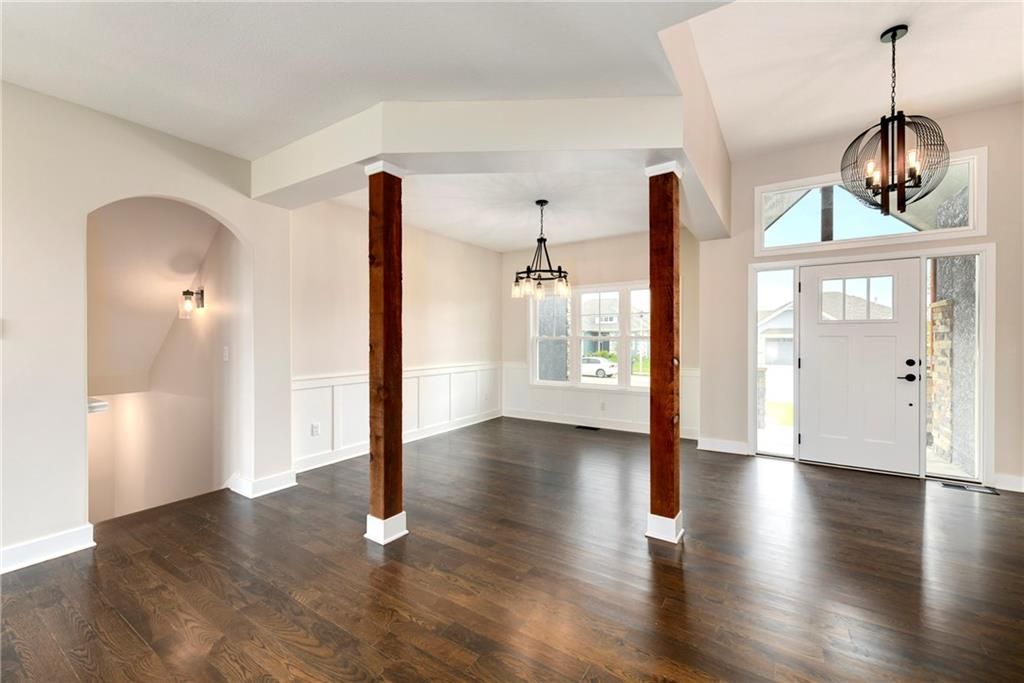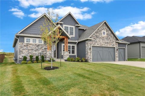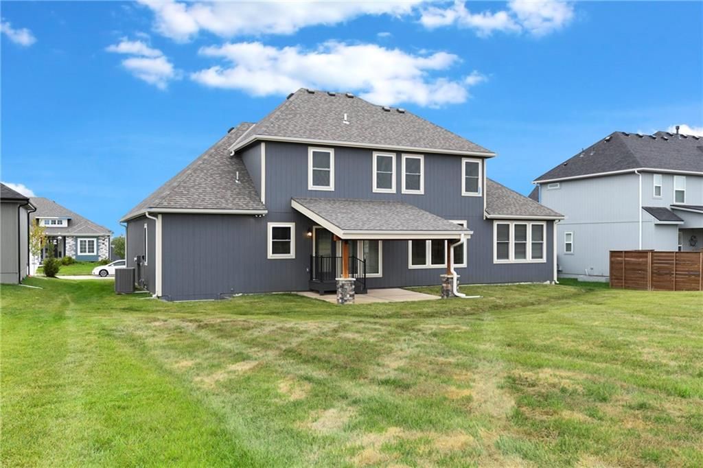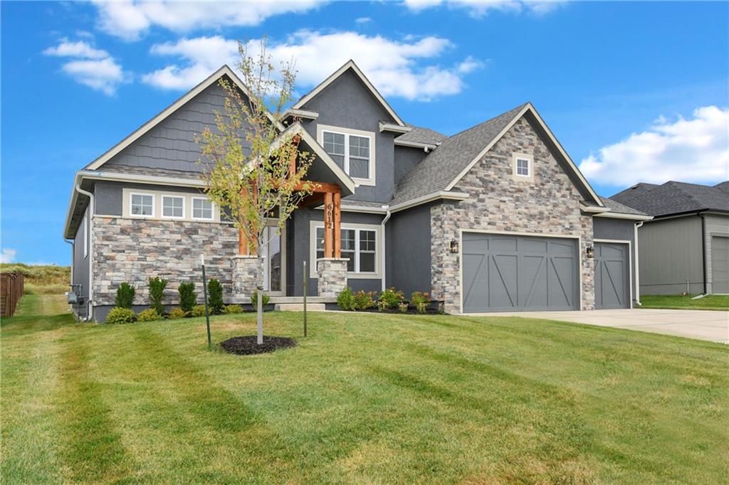 This thoughtfully designed 1.5-story offers a spacious open plan and high-end details throughout. Enter through the inviting foyer to the formal dining room, featuring rustic cedar columns and wainscoting. The living room showcases a stunning stacked stone fireplace with a rustic mantel and a picturesque view of the backyard. The open feel of the home is enhanced by the tucked-away staircase, adding to the inviting flow of the space. The kitchen is truly a chef's dream with a large center island and seating, a beautiful herringbone backsplash, quartz countertops, smooth cooktop, and glass transom cabinets. A walk-in pantry and butler's pantry with glass cabinets add extra storage and style. You'll love the thoughtfully placed sink overlooking the peaceful backyard. The main level primary suite is a true retreat with a vaulted ceiling and spacious walk-in closet with French doors. The luxurious bath includes a freestanding soaker tub, double vanity, coffee bar, and an arched entry to the walk-in shower. Rounding out the main floor are a laundry room, mudroom with coat hooks and boot boxes, and a half bath. Upstairs, you ll find three generously sized bedrooms, each with raised ceilings, en-suite private baths, and walk-in closets. There's also a walk-in linen closet for added convenience. The full basement is ready for your customization, with rough-in for full bath, an egress window for a future bedroom, and a sheetrocked ceiling - perfect for a future movie theater or entertainment space. Enjoy outdoor living on the covered patio with ceiling fan and take in the serene views. The landscaping is complete, and blinds are already installed in some areas. Built with superior craftsmanship by a boutique custom builder, this home is move-in ready with the builder available to handle any final punchlist items. Located in a wonderful neighborhood within a top-rated school district and best of all - no HOA dues! This JWM Custom Home is the total package!