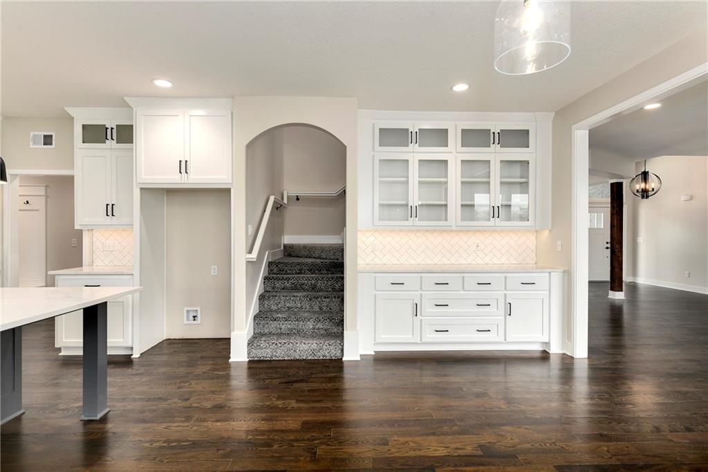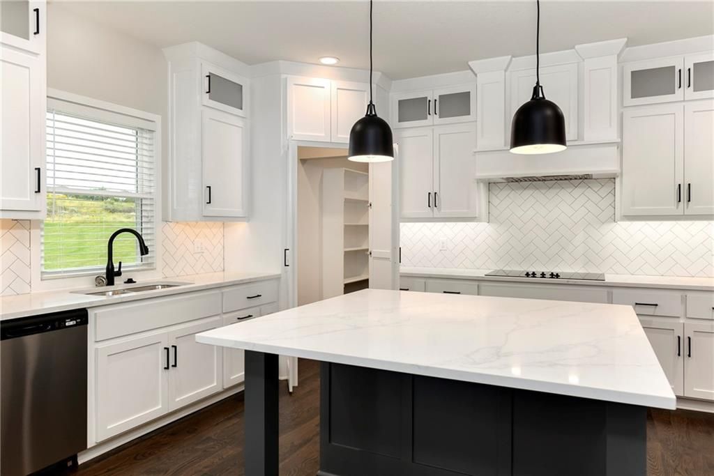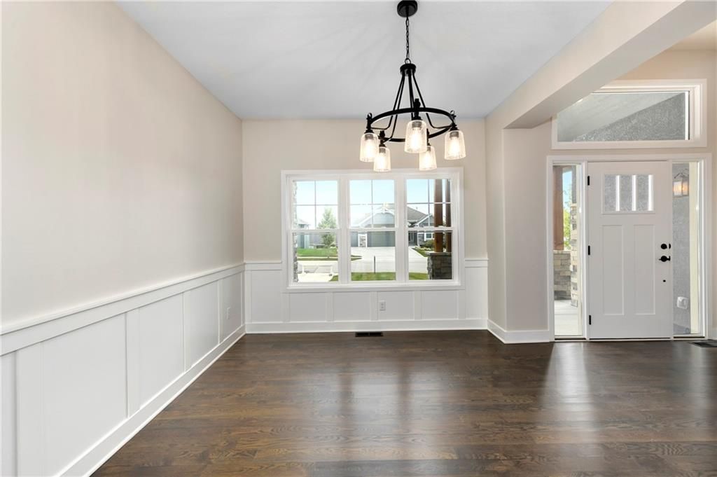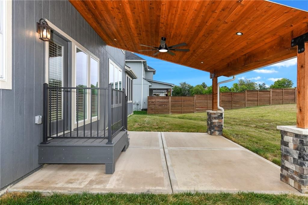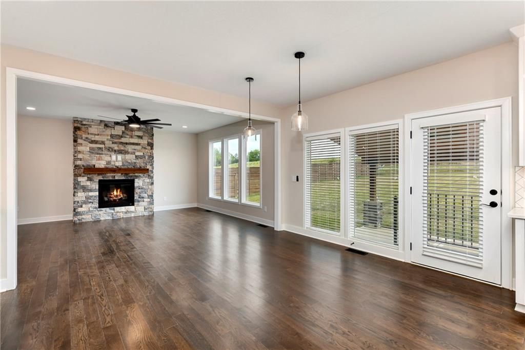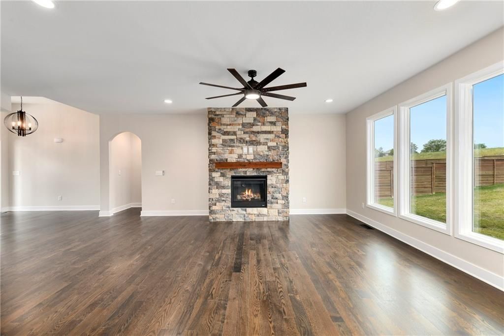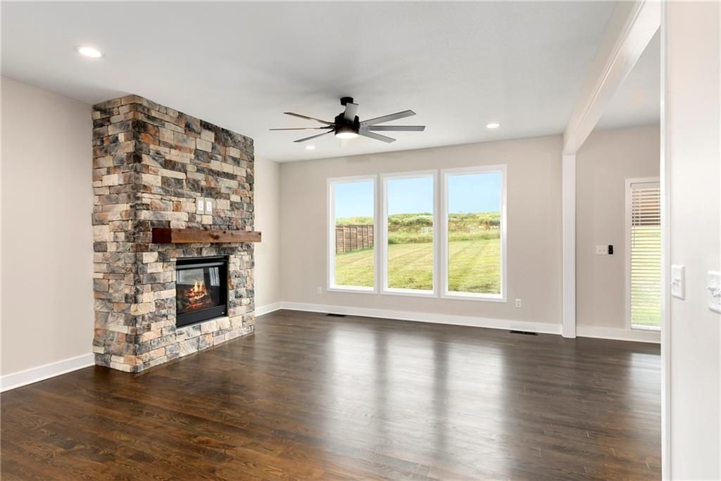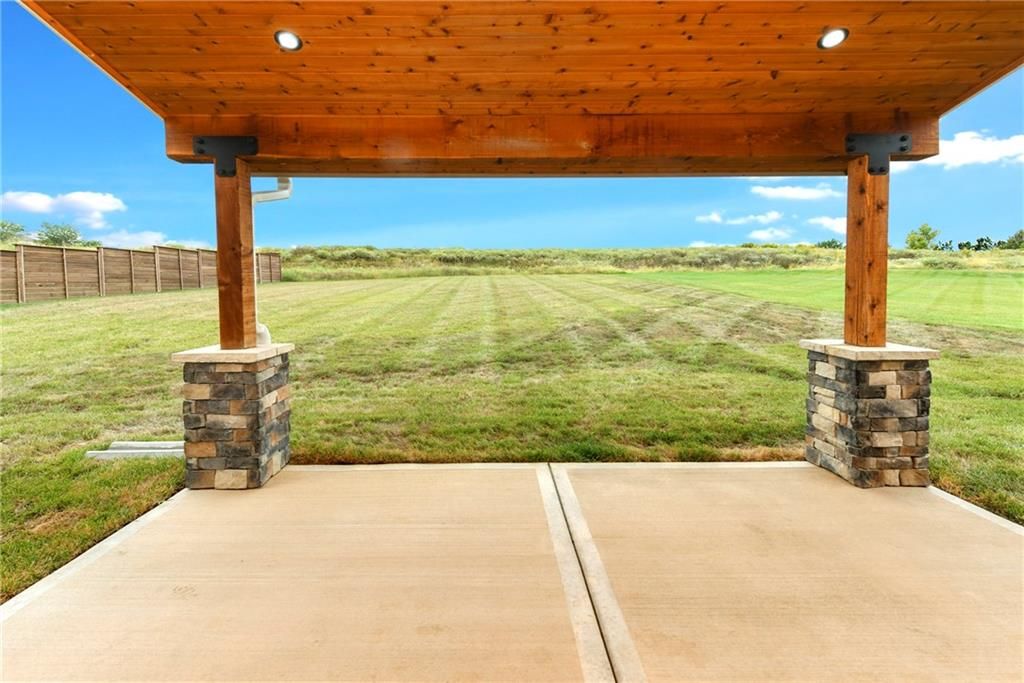 This thoughtfully designed 1.5-story offers a spacious open plan and high-end details throughout. Enter through the inviting foyer to the formal dining room, featuring rustic cedar columns and wainscoting. The living room showcases a stunning stacked stone fireplace with a rustic mantel and a picturesque view of the backyard. The open feel of the home is enhanced by the tucked-away staircase, adding to the inviting flow of the space. The kitchen is truly a chef's dream with a large center island and seating, a beautiful herringbone backsplash, quartz countertops, smooth cooktop, and glass transom cabinets. A walk-in pantry and butler's pantry with glass cabinets add extra storage and style. You'll love the thoughtfully placed sink overlooking the peaceful backyard. The main level primary suite is a true retreat with a vaulted ceiling and spacious walk-in closet with French doors. The luxurious bath includes a freestanding soaker tub, double vanity, coffee bar, and an arched entry to the walk-in shower. Rounding out the main floor are a laundry room, mudroom with coat hooks and boot boxes, and a half bath. Upstairs, you ll find three generously sized bedrooms, each with raised ceilings, en-suite private baths, and walk-in closets. There's also a walk-in linen closet for added convenience. The full basement is ready for your customization, with rough-in for full bath, an egress window for a future bedroom, and a sheetrocked ceiling - perfect for a future movie theater or entertainment space. Enjoy outdoor living on the covered patio with ceiling fan and take in the serene views. The landscaping is complete, and blinds are already installed in some areas. Built with superior craftsmanship by a boutique custom builder, this home is move-in ready with the builder available to handle any final punchlist items. Located in a wonderful neighborhood within a top-rated school district and best of all - no HOA dues! This JWM Custom Home is the total package!