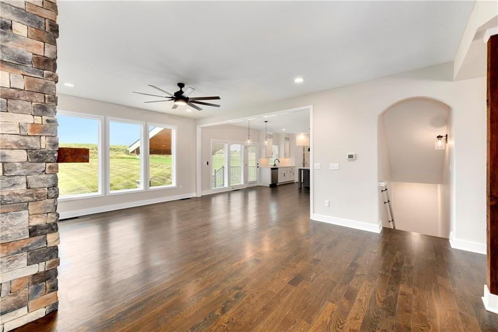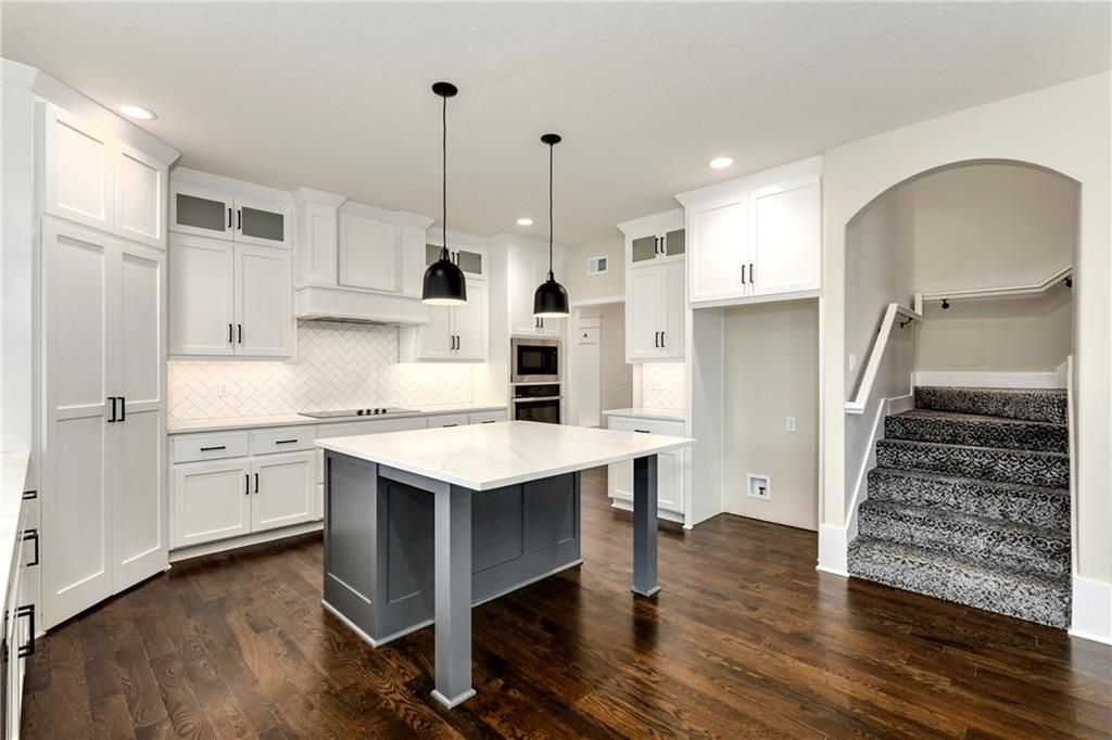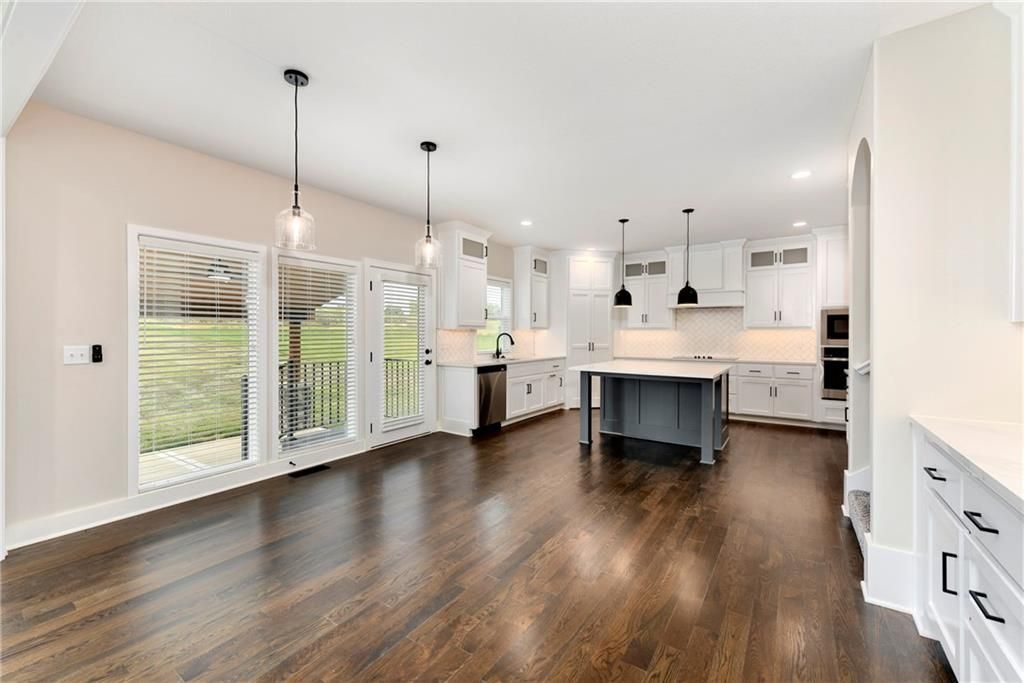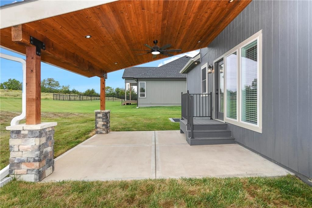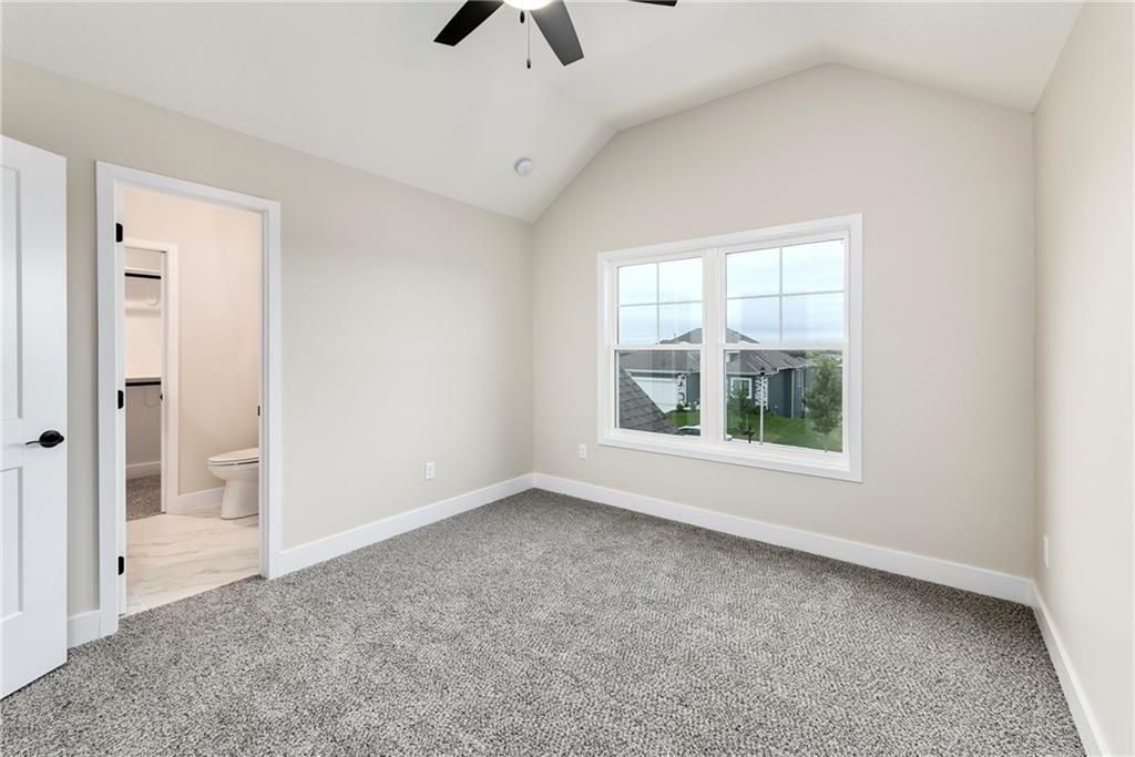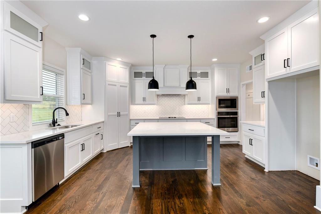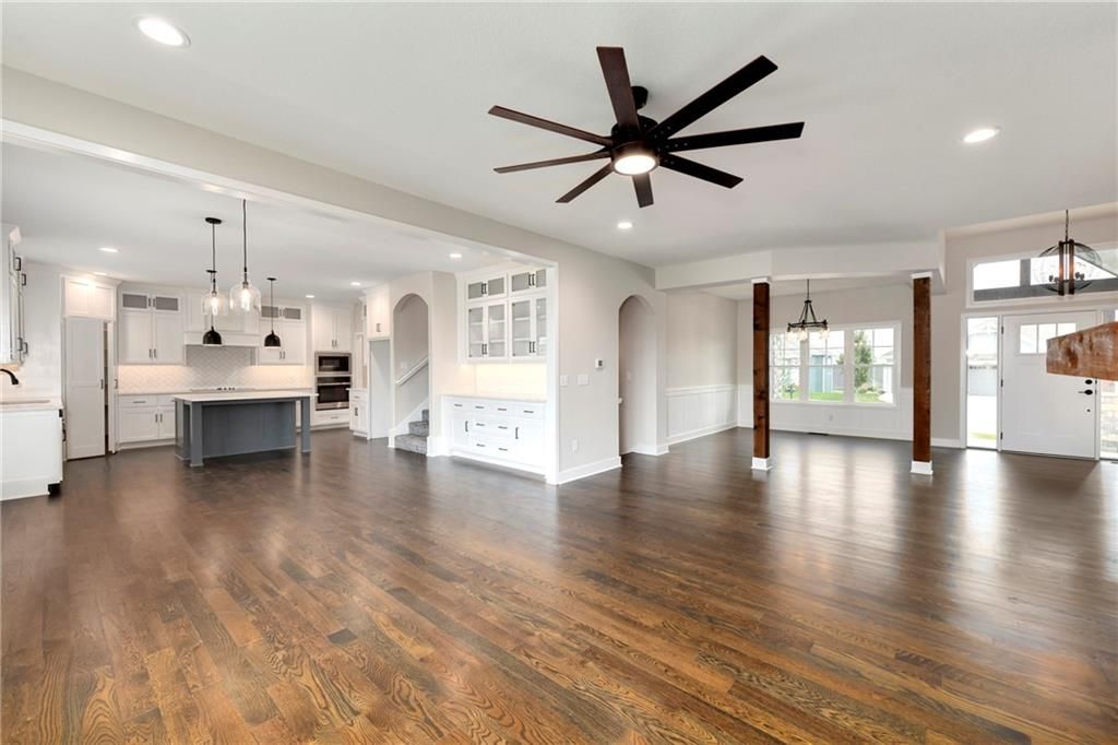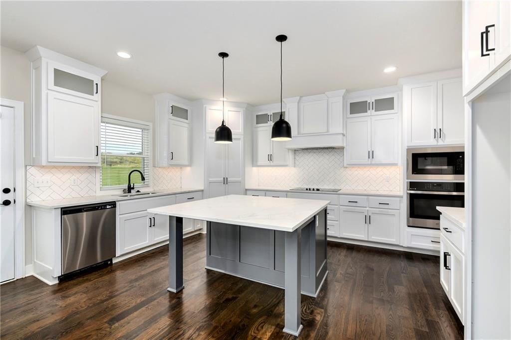 This thoughtfully designed 1.5-story offers a spacious open plan and high-end details throughout. Enter through the inviting foyer to the formal dining room, featuring rustic cedar columns and wainscoting. The living room showcases a stunning stacked stone fireplace with a rustic mantel and a picturesque view of the backyard. The open feel of the home is enhanced by the tucked-away staircase, adding to the inviting flow of the space. The kitchen is truly a chef's dream with a large center island and seating, a beautiful herringbone backsplash, quartz countertops, smooth cooktop, and glass transom cabinets. A walk-in pantry and butler's pantry with glass cabinets add extra storage and style. You'll love the thoughtfully placed sink overlooking the peaceful backyard. The main level primary suite is a true retreat with a vaulted ceiling and spacious walk-in closet with French doors. The luxurious bath includes a freestanding soaker tub, double vanity, coffee bar, and an arched entry to the walk-in shower. Rounding out the main floor are a laundry room, mudroom with coat hooks and boot boxes, and a half bath. Upstairs, you ll find three generously sized bedrooms, each with raised ceilings, en-suite private baths, and walk-in closets. There's also a walk-in linen closet for added convenience. The full basement is ready for your customization, with rough-in for full bath, an egress window for a future bedroom, and a sheetrocked ceiling - perfect for a future movie theater or entertainment space. Enjoy outdoor living on the covered patio with ceiling fan and take in the serene views. The landscaping is complete, and blinds are already installed in some areas. Built with superior craftsmanship by a boutique custom builder, this home is move-in ready with the builder available to handle any final punchlist items. Located in a wonderful neighborhood within a top-rated school district and best of all - no HOA dues! This JWM Custom Home is the total package!