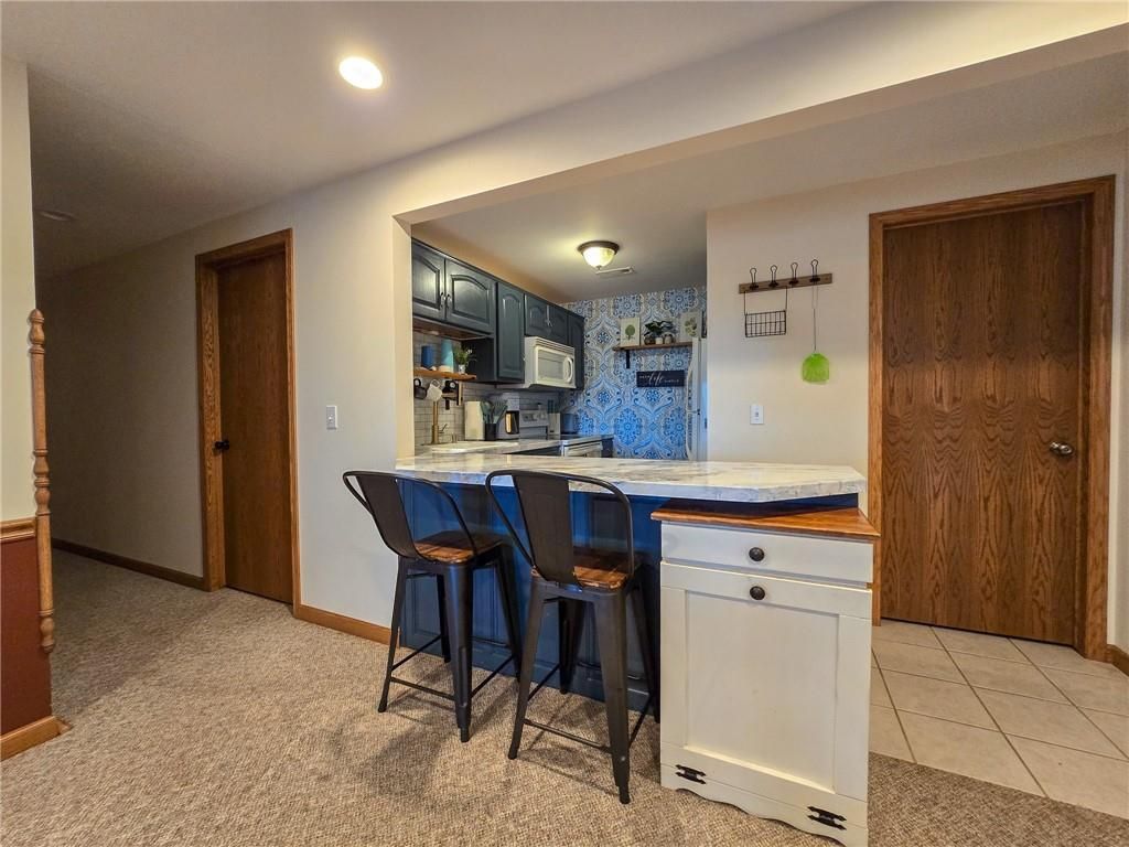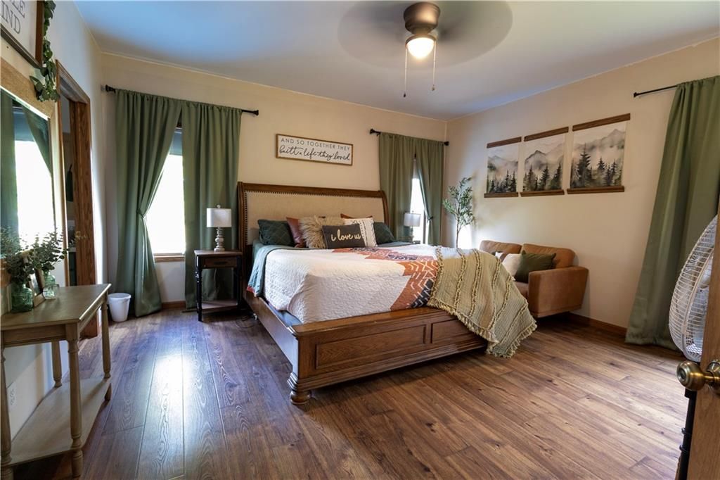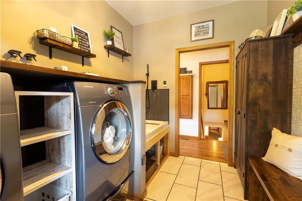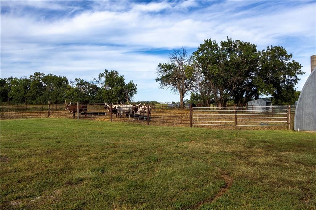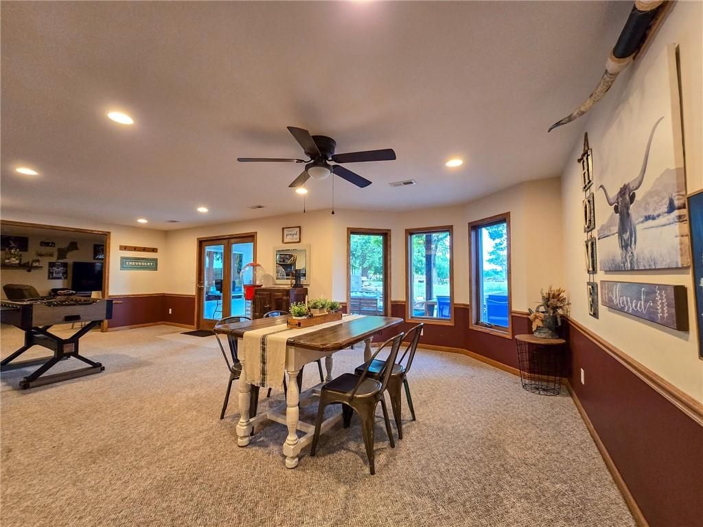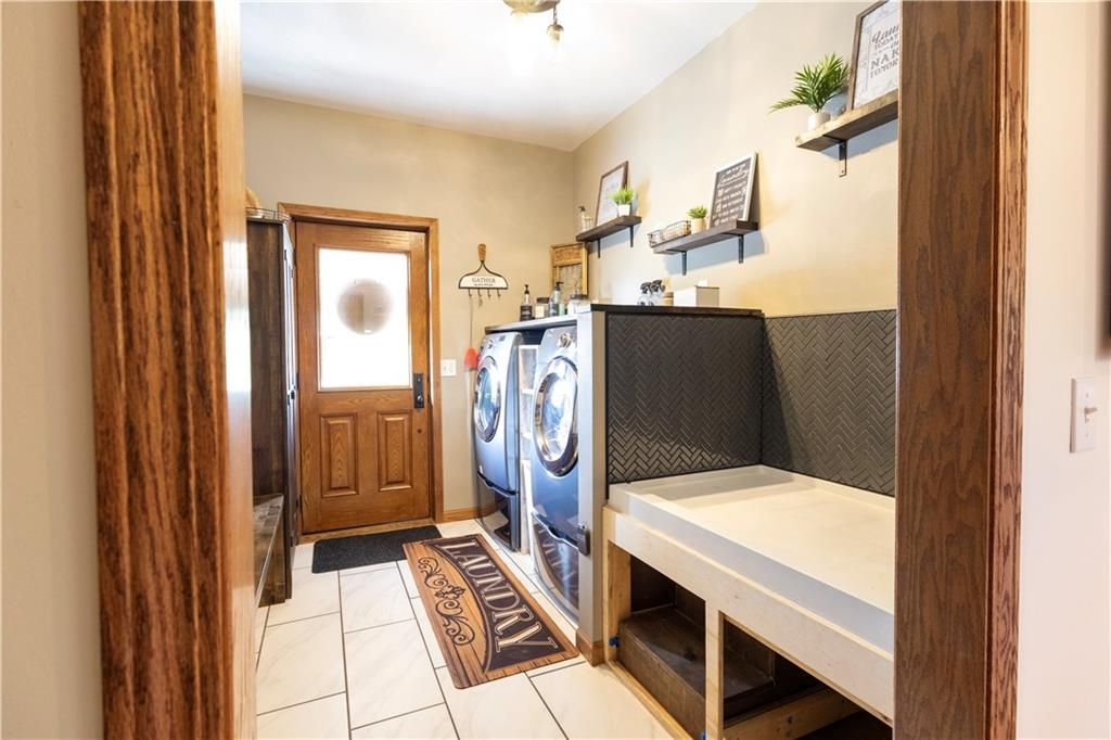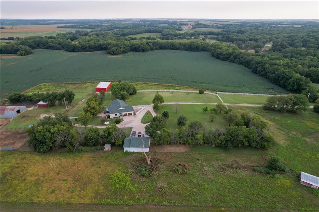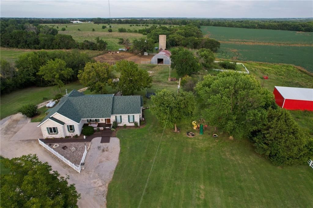 This property offers 10.11 acres in Marion County, Kansas, located at 674 Old Mill Road near Peabody. A gravel driveway leads from paved road access, providing privacy while maintaining access to amenities in Peabody. The home is 1998 sq ft on the main floor with a finished 1986 sq ft walk-out basement. The basement opens to a patio and includes a full kitchen, dining area, rec room, and office with a wood-burning fireplace. The main floor features an open layout with a kitchen island, a large living room with propane fireplace, and a dining area off the kitchen overlooking the patio and pool. A deck extends from the main level, providing views of the neighboring crop ground and creek bottom where wildlife frequent. The residence includes four bedrooms and three full bathrooms with two bedrooms each level. The master offers a bathroom with a Jacuzzi tub, separate shower and large walkin closets. If you are a pet lover, a pet wash bay provides an excellent addition to the laundry area. The exterior features three sides in brick construction and one side with vinyl siding. Utilities include rural water, and a well for those who prefer that option. The attached 2 car garage provides a place to park and avoid the elements. A detached two-car garage with insulation and a concrete floor provides additional covered parking and storage. Outbuildings include a Quonset-style shed used for livestock and a large metal framed pole barn that could be enclosed. The land includes small pastures suitable for rotational grazing of livestock or horses. Several pens and barns are located on site to provide shelter and weather protection. With a combination of acreage, a large home with extensive basement space, multiple outbuildings, rural water, and an additional well, this property offers both residential and agricultural utility. Views of fields and creek bottom create a setting to enjoy Kansas wildlife. Contact the listing agents today to schedule a showing!