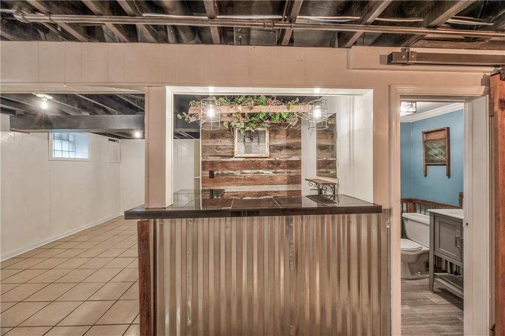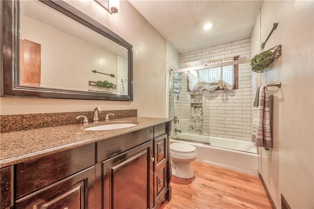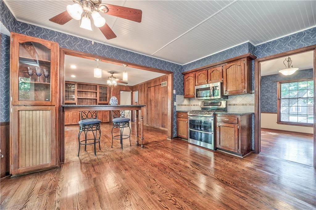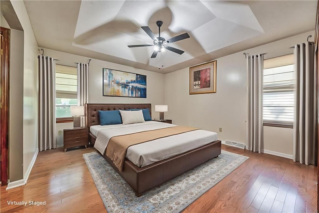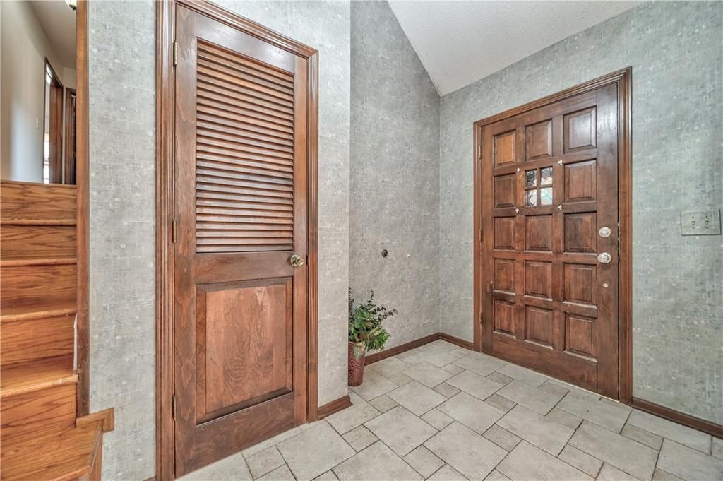 Welcome to this beautifully maintained home that blends timeless charm with modern updates. From the moment you enter, you're greeted by a spacious formal dining room - ideal for hosting gatherings. Gorgeous hardwood floors flow throughout most of the main and second levels, enhancing both style and function. The great room boasts rich cabinetry with custom-built doors with glass from a demolished 1880's church in England and a brick fireplace which adds warmth and historic character. The well-appointed kitchen offers a gas range, stainless steel appliances, and abundant counter space, making everyday cooking and entertaining a pleasure. The spacious primary suite boasts vaulted ceilings, a walk-in closet, an additional secondary closet, as well as a private bath with a walk-in shower. Upstairs, you will also find two additional bedrooms - one with a charming barn door - and an updated hall bathroom featuring granite countertops, stylish subway tile, and built-in shelving. Ascend to the third level to the fourth bedroom with carpet and attic access. The finished lower level offers a versatile recreation room with a sleek linear electric fireplace and a wet bar, perfect for entertaining family and friends. Updates include a new AC unit, new water heater, remodeled bathrooms, most windows replaced, a gas stove, many modern light fixtures, new garage openers and exterior paint Fall 2024. The unfinished basement area includes shelving and some LVP flooring, providing ample storage options. Step outside to enjoy the beautifully landscaped, fully fenced backyard, featuring a spacious deck, ornamental pond, and lush surroundings - an ideal space for relaxation or outdoor entertaining. The oversized garage offers even more storage space. The roof is approximately 4 years old, and the gutters are equipped with Gutter Helmet gutter guards for added convenience. This unique home is a must-see, offering space, character on a no outlet street in a fantastic Lenexa location.