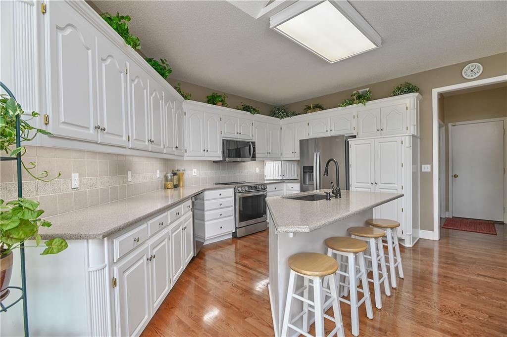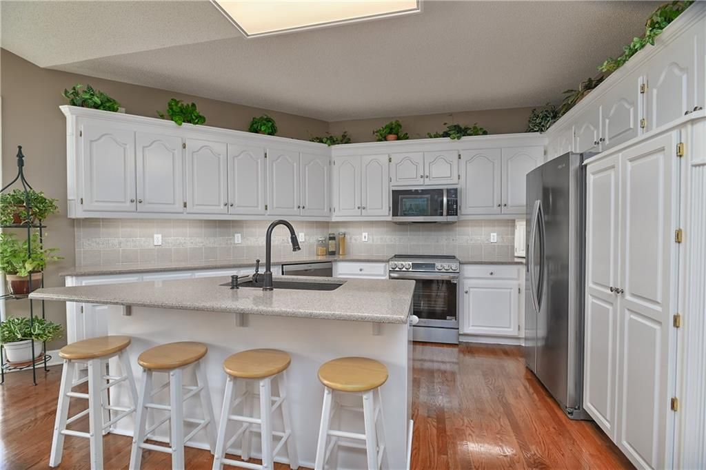 20,000 Price Improvement! Beautifully maintained home that is ready for you. As you enter, you will be greeted with the fabulous view overlooking trees and green space. The main floor features beautiful hardwood floors, an open floor plan, soaring ceilings and a light, bright setting. Spacious hearth room kitchen is well appointed with stainless steel appliances, quartz countertops, breakfast bar seating and a pantry. The main floor primary is enormous and has an updated primary bath with custom cabinetry, heated tile floors, a closet system and a cozy fireplace to soak away the day! Upstairs there are very generously sized bedrooms, all with walk-in closets. All have direct access to baths - one is a jack and jill. The finished walk out basement has something for everyone. This wide open room is perfect for game tables with lots of space left for seating to watch the big games and movies. The lower level also includes a workshop room, plenty of storage, another full bath and custom cabinetry to keep you organized. Next up - walk out to your covered patio and enjoy to the quiet scenery. Several updates include a new composite deck 2024, new HVAC 2023 with electronic damper, New HWH 2021 plus the garage floor has an epoxy coating! This is the perfect location with easy highway access, close to numerous grocery stores, restaurants, the new Lenexa Aquatic center, the Millcreek walking trails plus a neighborhood elementary school.**Please excuse our mess - home is being prepared for an estate sale Oct 23-25 **