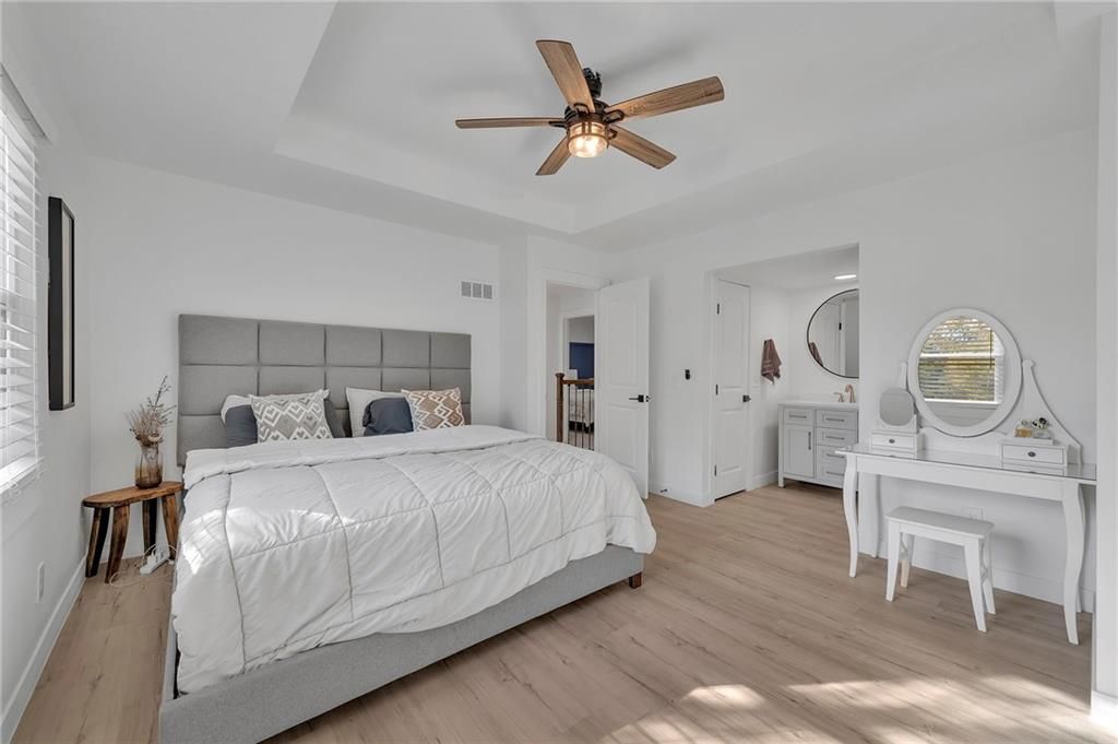 Beautifully updated 3 bed / 2 bath home in Country Squire. The list of recent updates includes a newer roof (2022), LVP flooring throughout both floors, windows, exterior paint, kitchen appliances and more! Walk into the living room featuring vaulted ceilings and an electric fireplace with shiplap accent wall. The kitchen includes quartz countertops, stainless steel appliances, tile backsplash, and farm sink. Three good sized bedrooms upstairs and remodeled bathrooms. Additional living space downstairs perfect for an office or movie room. Step out to the spacious backyard with a new wood fence and patio perfect for hosting company. All in close proximity to shops and restaurants with easy highway access!